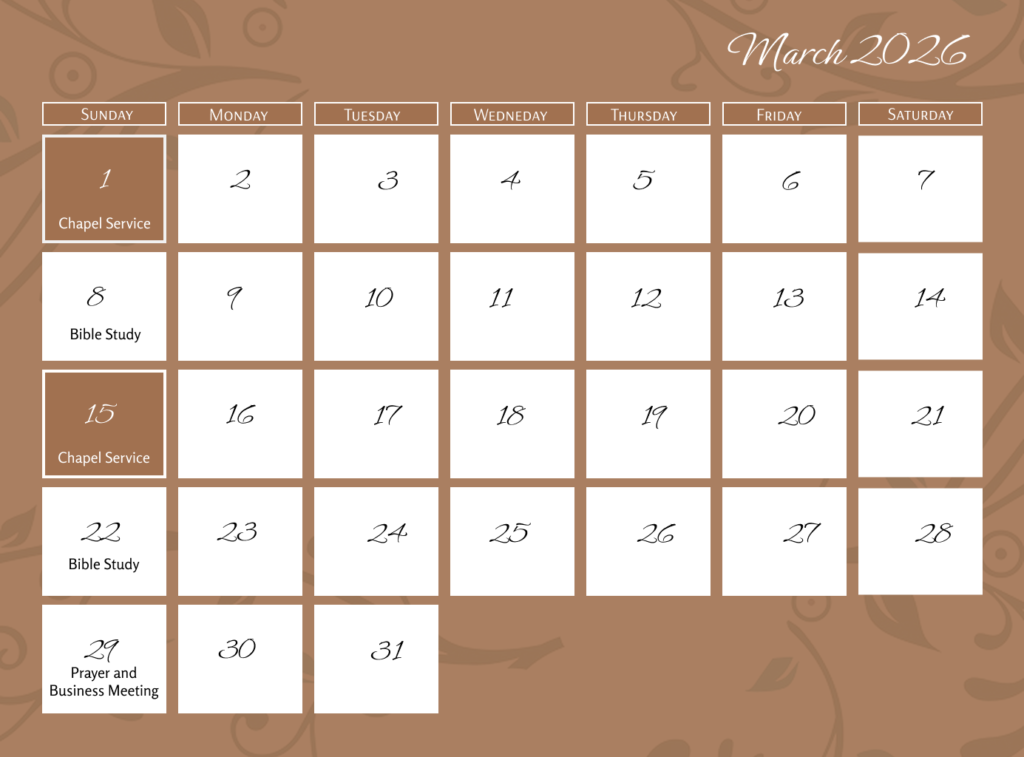 Our Chapel Service is the first and third Sunday of every month at 10:00 am. We meet at the same time and place on the second and fourth Sunday for Bible Study.